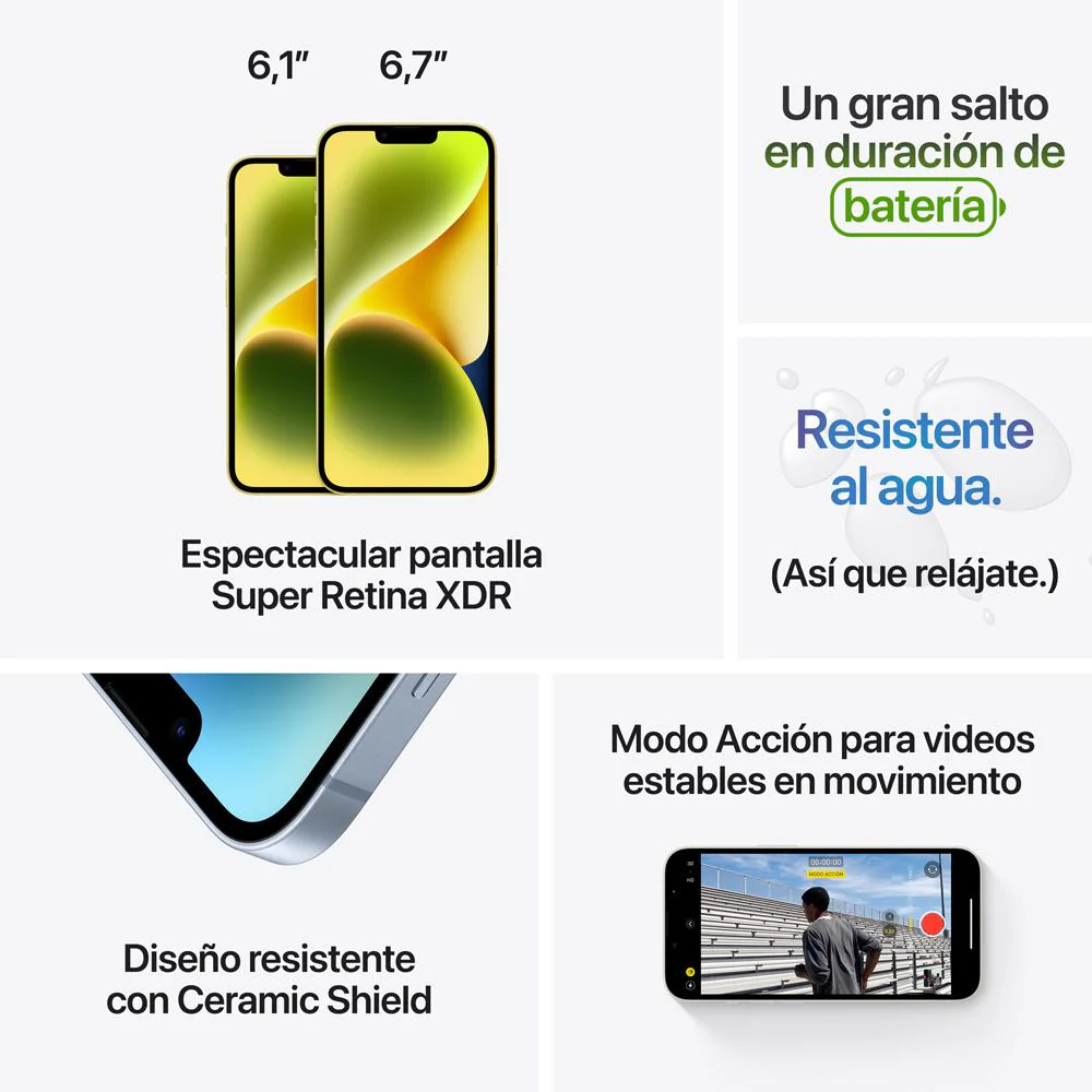 El iPhone 14 Plus tiene una pantalla de 6.7 pulgadas, una batería que te acompaña todo el día, un sistema de dos cámaras que te permite tomar fotos espectaculares en condiciones de mucha o poca luz y Detección de Choques, una funcionalidad de seguridad que puede identificar si sufres un accidente automovilístico grave y pedir ayuda.