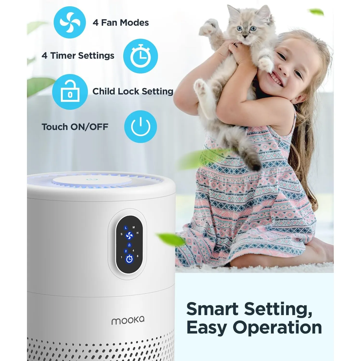 Funciones adicionales: 4 opciones de temporizador (1h, 2h, 4h, 8h) para programar el tiempo de funcionamiento. 4 modos de ventilador (Sleep, Low, Med, High) para ajustar la captura de contaminantes. Luz nocturna suave, que se puede encender o apagar manteniendo el aparato en funcionamiento. Filtro de repuesto recomendado cada 3-6 meses dependiendo del entorno y frecuencia de uso.