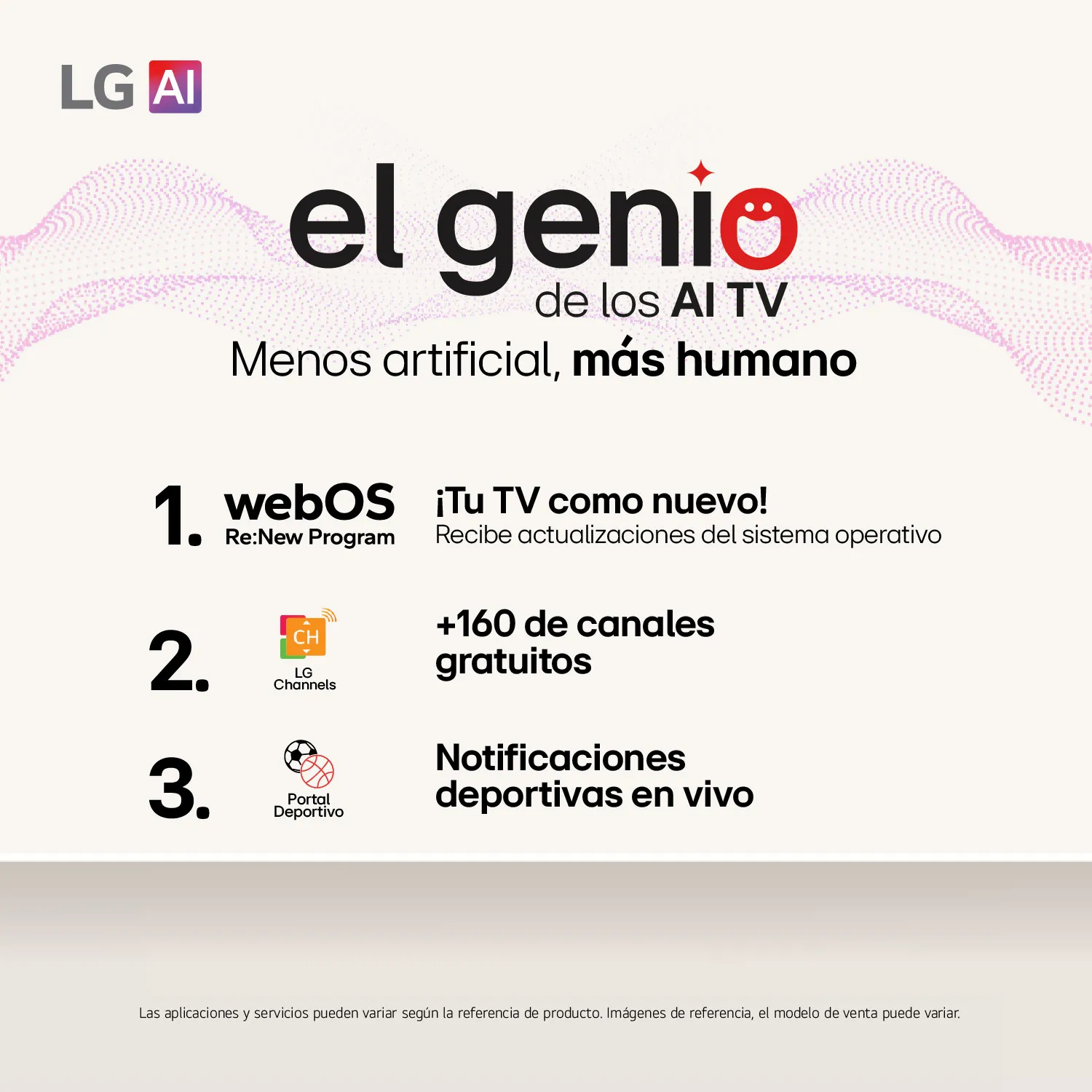 Aplicaciones destacadas: LG Channels gratis, Netflix, YouTube, Prime Video, Disney+, Apple TV+, HBO Max, Claro Video, DirecTV GO