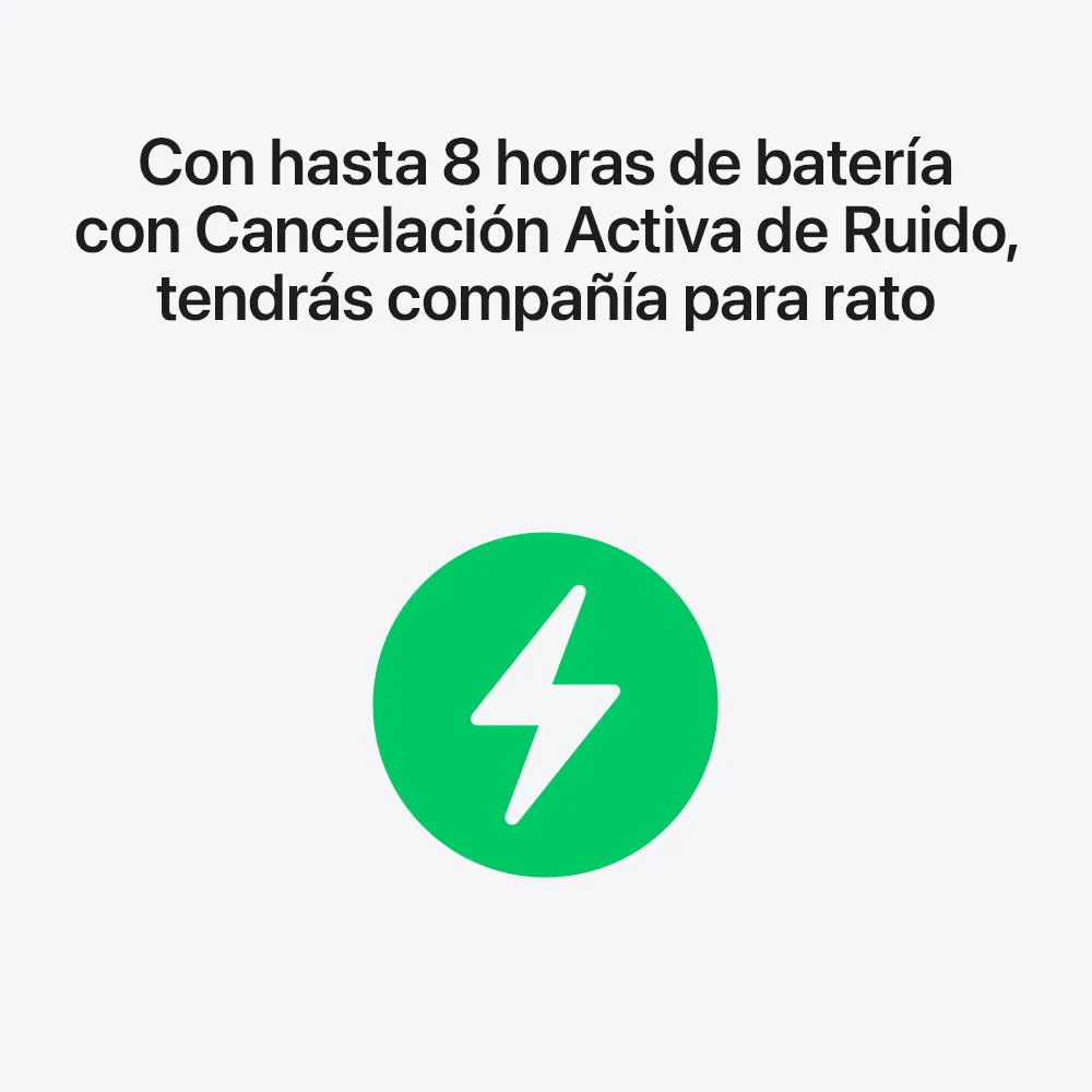 MAYOR DURACIÓN DE LA BATERÍA — Disfruta hasta 8 horas de audio con Cancelación Activa de Ruido con una sola carga.