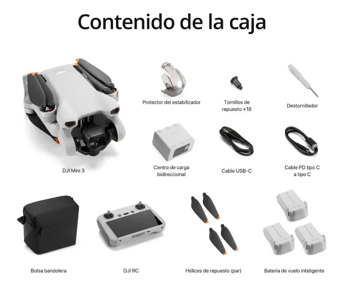 DJI Mini 3 es compatible con: control remoto DJI RC-N1 y sus accesorios correspondientes, DJI RC, cargador USB-C 30 W DJI, cargador USB 18 W DJI, batería de vuelo inteligente DJI Mini 3 Pro, batería de vuelo inteligente Plus DJI Mini 3 Pro, centro de carga bidireccional DJI Mini 3 Pro, sujeciones de hélices DJI Mini 3 Pro, juego de filtros ND DJI Mini 3 Pro y bolsa bandolera DJI Mini 3 Pro.
