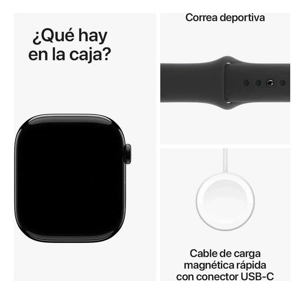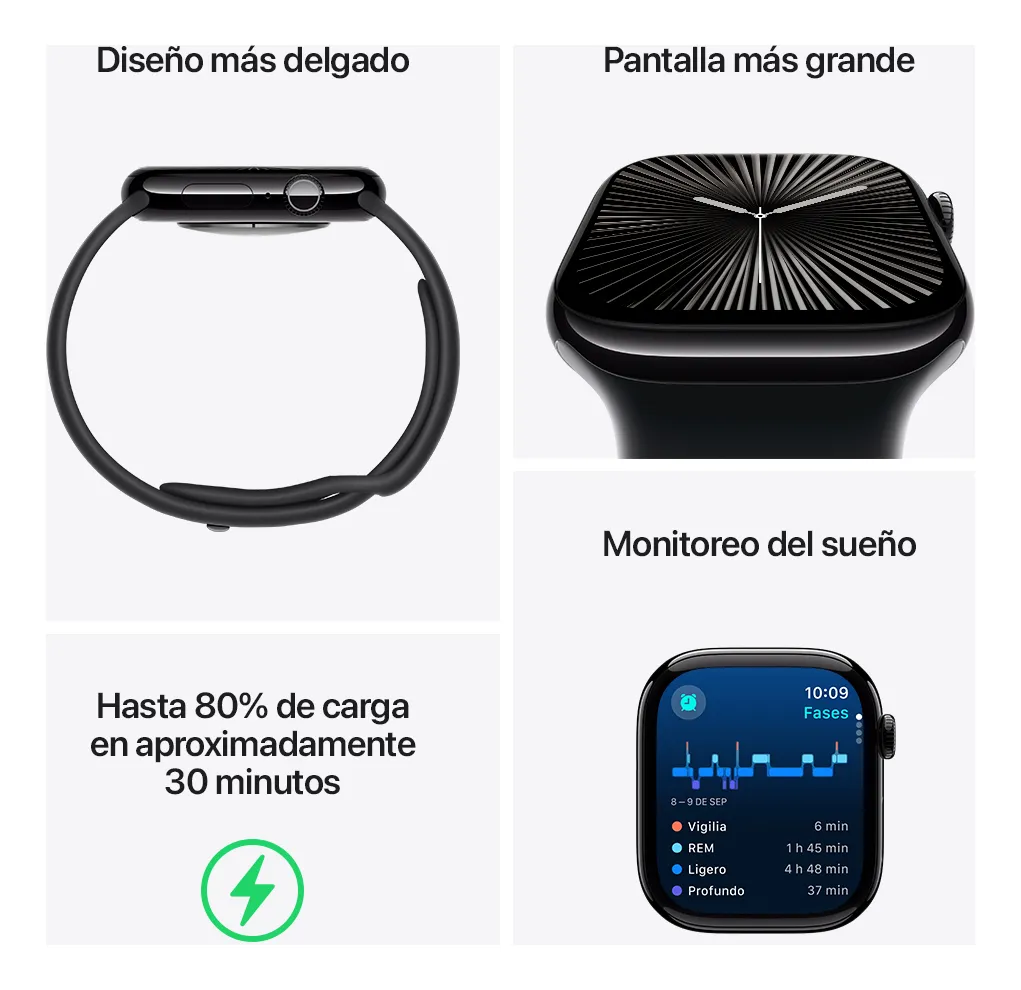 • POR QUÉ EL APPLE WATCH SERIES 10 — Pantalla más grande con un área de visualización hasta un 30% mayor.¹ Diseño más delgado, liviano y cómodo.¹ Avanzadas funcionalidades de salud y fitness con datos relevantes.² Funcionalidades de seguridad para pedir ayuda cuando más la necesites.³ Una carga más rápida que te da un 80% de batería en aproximadamente 30 minutos.⁴
