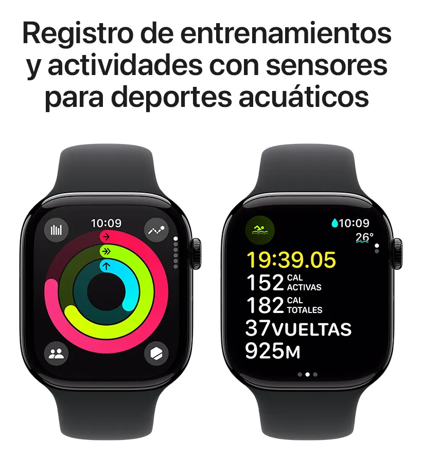 • EL MEJOR COMPAÑERO DE ENTRENAMIENTO — Registra todos tus movimientos con los círculos de Actividad, que puedes personalizar de acuerdo a tu estilo de vida. Accede a datos avanzados para varios tipos de entrenamientos con la app Entrenamiento. Mide la intensidad de tus entrenamientos con Carga de Entrenamiento. Usa los sensores de profundidad y temperatura del agua para aprovechar al máximo tus aventuras acuáticas. Además, el Apple Watch viene con tres meses gratis de Apple Fitness+.⁹